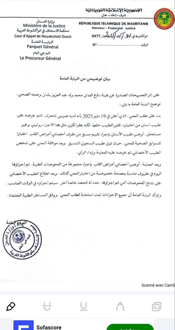 وأضافت النيابة في بيان نشرته أمس وزارة العدل على صفحتها على الفيسبوك ؛ أن ولد عبد العزيز “خضع لفحص طبي بعد شكواه من تحرك أحد أضراسه، حيث قرر طبيب الأسنان خلعها، لكنه أوصى أولاً بإجراء تقييم طبي من قبل أخصائي أمراض القلب، نظرًا لسوابقه الصحية”