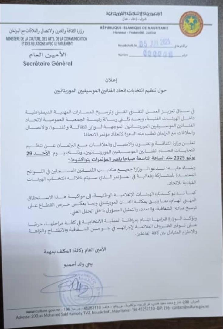أعلنت وزارة الثقافة والفنون والاتصال والعلاقات مع البرلمان عن تاريخ انعقاد المؤتمر العام الثالث لاتحاد الفنانين الموسيقيين الموريتانيين.
