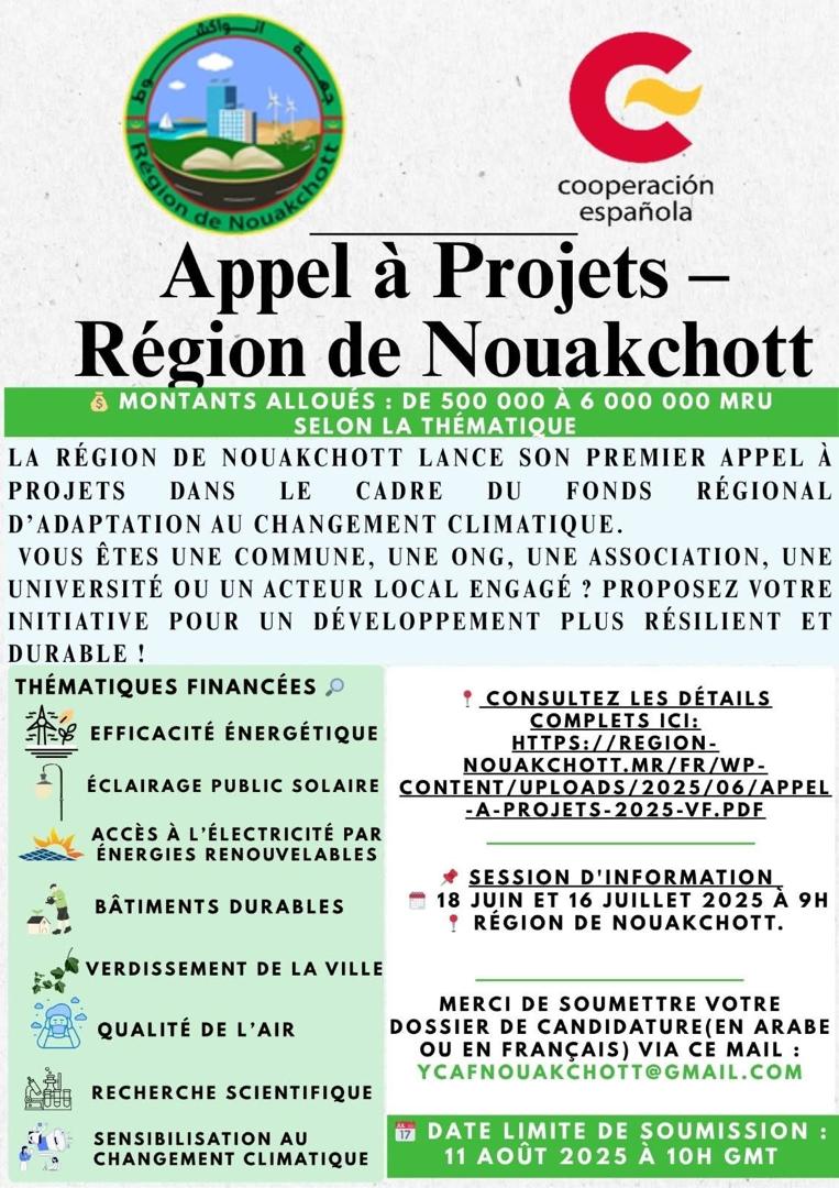 اعلنت جهة نواكشوط اليوم الأخد عن استقبال تقديم المشاريع في إطار الصندوق الجهوي للتكيف مع التغير المناخي، لتمويل المبادرات المحلية المبتكرة لصالح المناخ