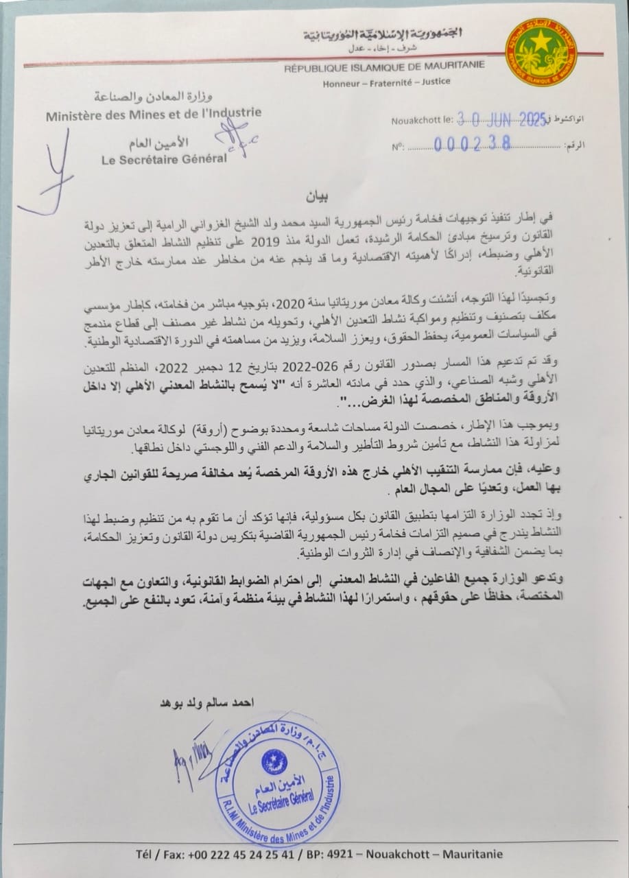 وأكدت الوزارة في بيان وقعه الأمين العام أحمد سالم ولد بوهد أن ممارسة التنقيب الأهلي خارج هذه الأروقة المرخصة يُعد مخالفة صريحة للقوانين الجاري بها العمل، وتعديًا على المجال العام .