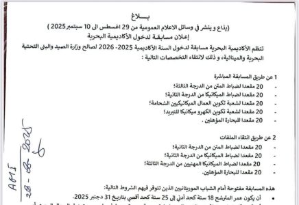 قبس + وكالات كشفت الأكاديمية البحرية، عن تنظيم مسابقة ،لانتقاء 180 مقعدا ،لدخول السنة الأكاديمية 2025 – 2026.