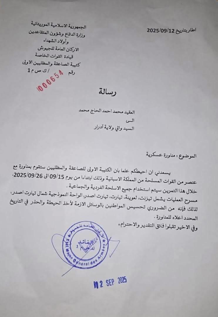 ووفق رسالة رسمية موجهة من قائد الكتيبة الأولى للصاعقة والمظليين إلى والي آدرار، فإن هذه المناورات ستشهد استخدام مختلف أنواع الأسلحة الفردية والجماعية، وستجري على مسرح عمليات يشمل مناطق تيرس، أوجفت، أطار، إصدار الواحة النيوزوجية، وشمال تيرات.
