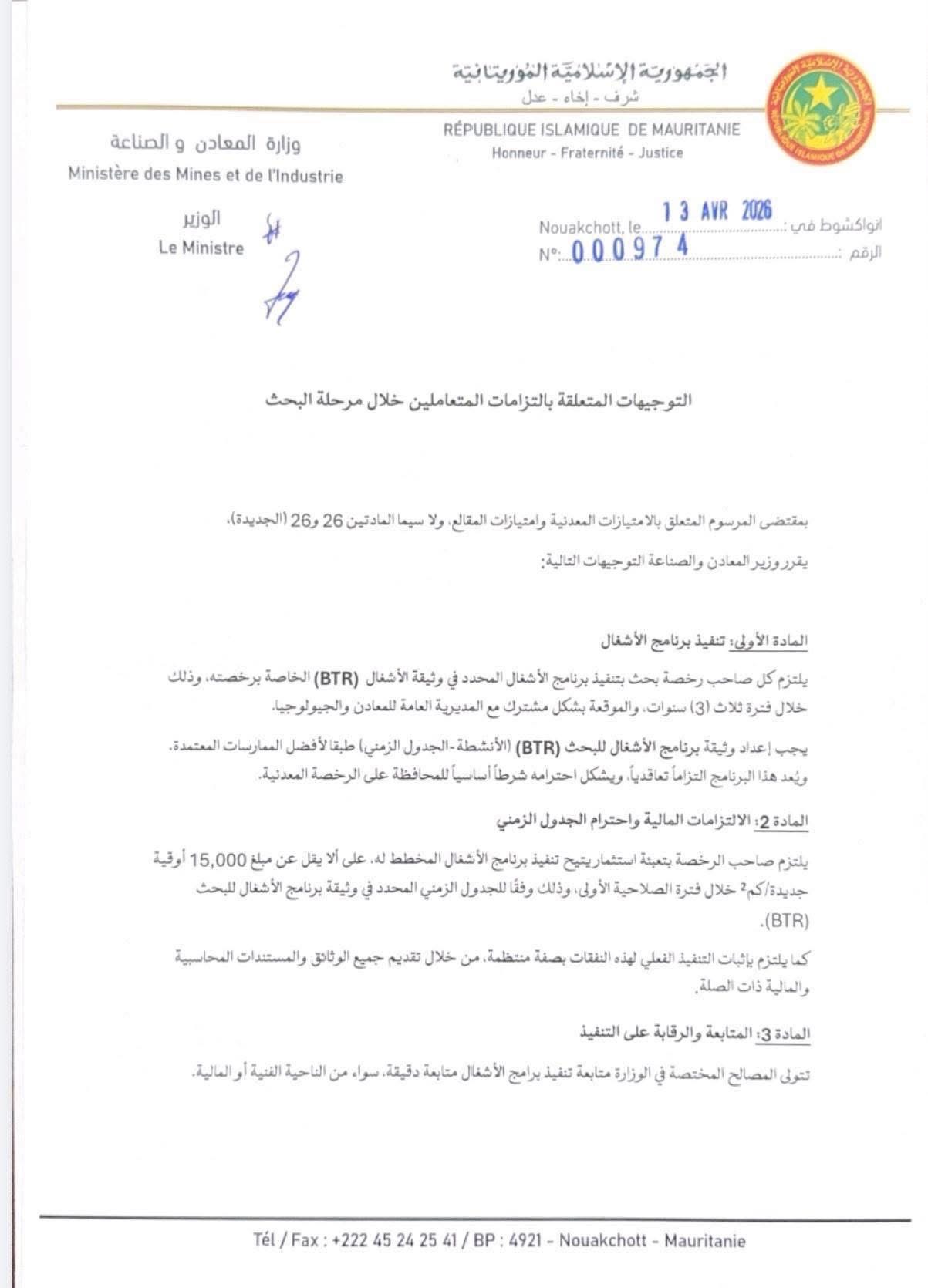 وأوضحت الوزارة أن الإجراءات تشمل إلزام حاملي رخص البحث بتنفيذ برامج الأشغال المحددة، وإنفاق حد أدنى يصل إلى 15 ألف أوقية جديدة لكل كيلومتر مربع، مع تقديم وثائق محاسبية تثبت ذلك.