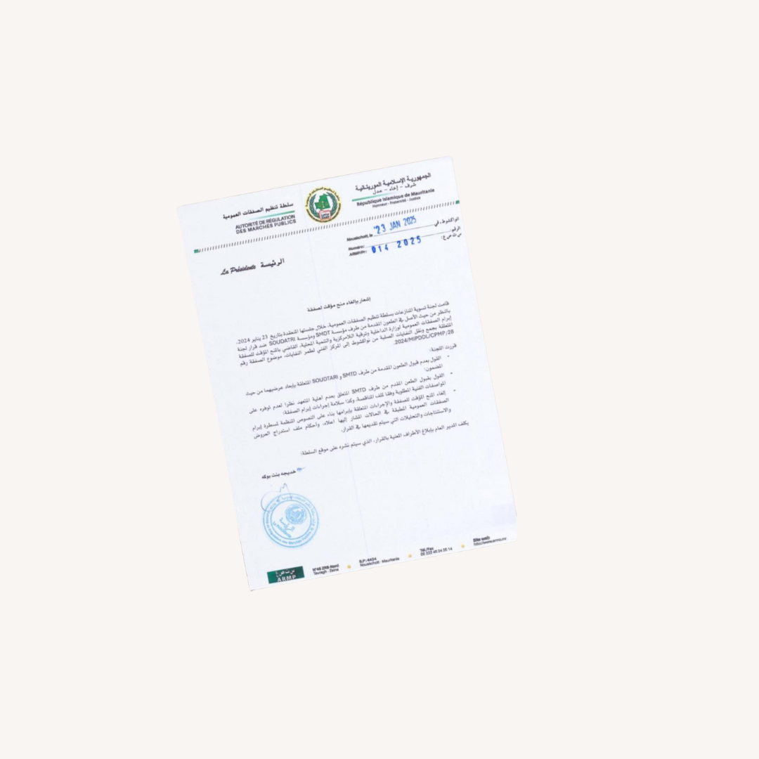 وأضافت أن قرار الإلغاء اتخذ بناء على الطعن المقدم من طرف شركة SMTD الموريتانية والمتعلق “بعدم أهلية المتعهد نظرا لعدم توفره على المواصفات الفنية المطلوبة وفقا لملف المناقصة، وكذا سلامة إجراءات إبرام الصفقة”.