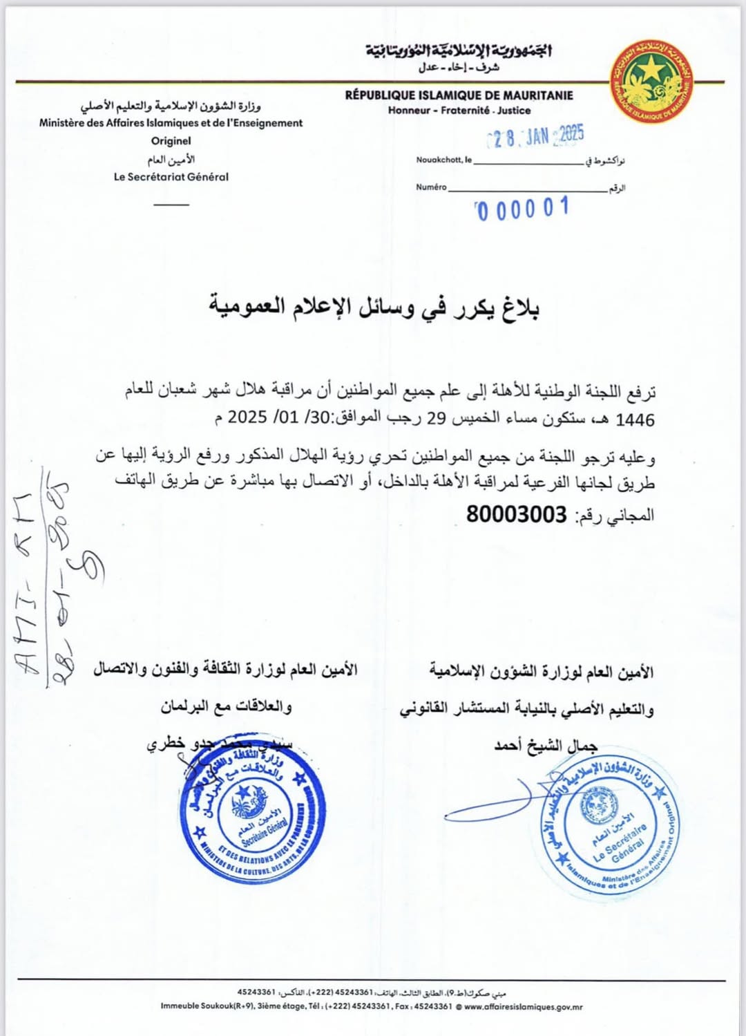 وأكدت اللجنة طلبها، للمواطنين، برفع رؤية هلال شهر شعبان إليها، عن طريق فروعها بالداخل الموريتاني، أو الاتصال بها مباشرة عن طريق الهاتف المجاني رقم 80003003.