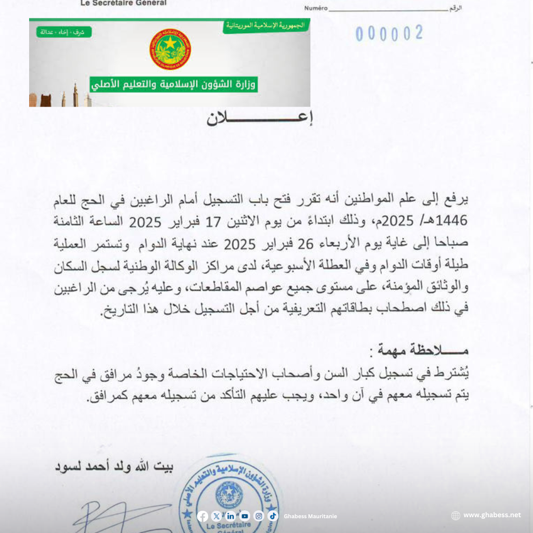أعلنت وزارة الشؤون الإسلامية والتعليم الأصلي، أمس الخميس؛ عن بدء التسجيل للراغبين في أداء فريضة الحج لهذا العام، حيث يبدأ التسجيل يوم الإثنين 17 فبراير 2025 ويستمر حتى الأربعاء 26 من نفس الشهر.